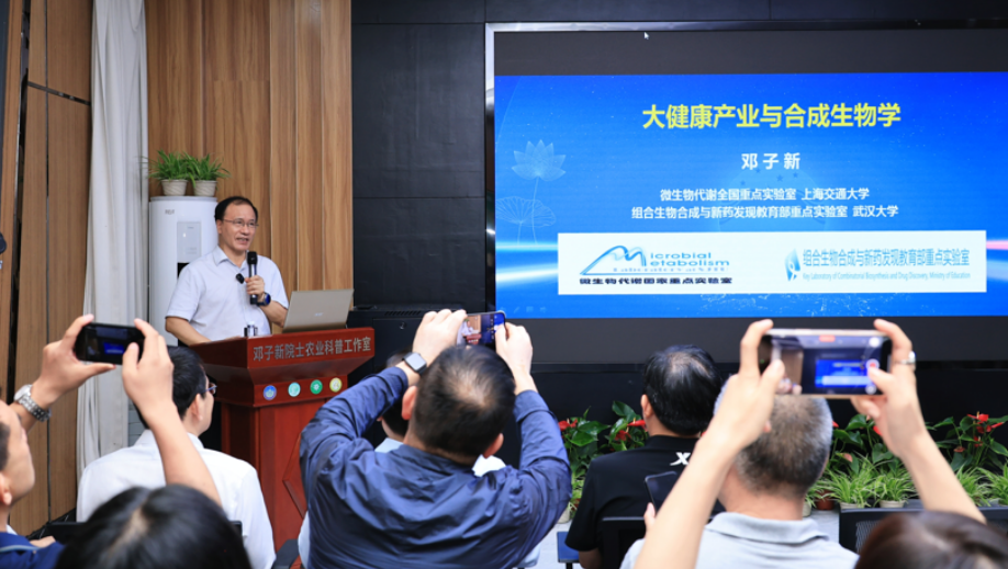 我们原来生产一个药物如青霉素,是找到一个微生物,通过微生物产生产品。今天我们可以从众多的微生物中找到基,然后在细胞里面设计这种产品。从被动到主动,从利用到创造设计,根本性地改变今天大健康产品的研发和生产路径,成为人类大健康产业颠覆性创新和跨越式发展的科技集成。我们要借用合成生物学这种手段来颠覆重大品种的合成工艺,来打破国外一些大品种的垄断,通过人才培养、技术研发,产业孵化来带动传统健康产业向现代产业转型升级换代。”邓子新院士在主题为《大健康产业与合成生物学》的科普讲座上介绍,近年来合成生物学快速发展成为大健康科技创新的新质驱动力。它与机械和土木工程“异曲同工”,是根据需求场景,设计蓝图。根据蓝图备料、施工、装修、复修、成型。从这个意义上讲,它是一门工程学,只不过机械工程和土木工程用的是砖头瓦块,零件底盘,而合成生物学用的是基因、蛋白、调控原件和细胞底盘。这是工科融入理科形成的新工科,是微观生物体宏观的工程化,已经开始渗透到国计民生人类健康无处不在的各个领域,包括医药、环境、健康、能源等,成为变革性改造或颠覆着传统大健康产品的研发路径。
