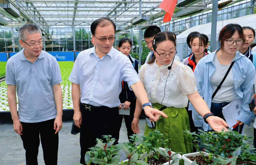 “这是红凤菜,无土栽培,采用人工光和自然光相结合DFT水培技术,可通过配方调节满足植物不同生长阶段光能需求,提高作物产量和品质。”“这些阳台蔬菜采用基质栽培,配合拱门式支架,适合藤蔓比较长、茎叶较多的作物,如番茄、黄瓜、丝瓜等。”同学们跟随着专家的讲解,参观了科普研学区,沿途各种方式栽培的蔬菜让大家看得目不转睛。