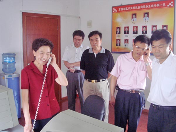 湖北省科协党组书记、常务副主席曲颖(左一)在东西湖区农业科普110总机房内与农业专家通话。右一为党组书记、主席卢光发。