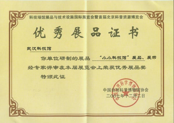 在2007年11月30日至12月2日的全国“科技场馆展品与技术设施国际展览会暨首届北京科普资源博览会”上,武汉科技馆自行研制的参展展品“无弦琴”、“声波看的见”、“机翼与小球”、 “看谁转得快”、“最速降线”、“间歇喷泉”、“尼普科夫转盘”被中国自然科学博物馆协会授予“优秀展品奖”。