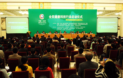 10日下午,由科技部、卫生部、中宣部、国家中医药管理局、国家食品药品监督管理局、中国科学技术协会等14个部门共同主办的“全民健康科技行动启动仪式暨首届健康科技高峰论坛”在人民大会堂隆重举行。中共中央政治局委员、国务委员刘延东出席启动仪式并发表重要讲话。全国政协副主席、科技部部长万钢,卫生部部长陈竺分别致词。中国科协副主席、书记处书记齐让等主办部门领导出席启动仪式。医药健康科技界、企业界、医学院校师生代表约300人参加启动仪式。启动仪式由科技部副部长刘燕华主持。
