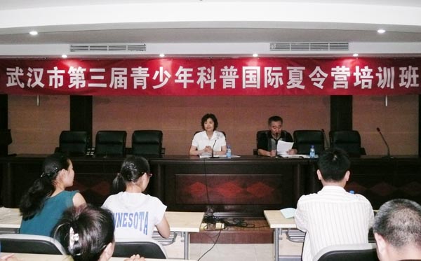 由和武汉市教育局联合主办的“武汉市第三届青少年科普国际夏令营”于2008年7月16日上午在举行了培训会议。副主席杨军同志及本次夏令营活动的全体营员参加了本次会议。培训会议的主要目的是向参加夏令营的营员讲解此次夏令营的行程活动内容和出国注意事项等事宜,并介绍了日本国的地理地貌、风土人情,学习了简单的日语对话。
