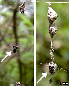 为了证实这一猜测,他们用生活在远离台湾东南海岸的兰屿岛上的二角尘蜘进行试验。这种蜘蛛用昆虫残体和卵囊两种东西装饰蛛网。然而令人感到吃惊的是,它们会把捕猎球(prey pellet)和卵囊制成跟自己的体型一样大。这些研究人员还发现,对大黄蜂来说,这些东西显然跟蜘蛛拥有相同的颜色,而且反射光线的方式一样。蜘蛛把装饰物制成跟自己大小一样、外观和形状类似。