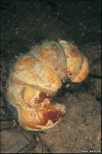 指甲履螺形成的另一个交配链。它们是一种海洋蜗牛,25个同类叠加在一起形成一座塔。底部指甲履螺通常是雌性。在它死后,上面的雄性便变性为雌性,让这个链条得以维系。