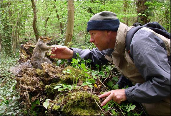 这名男子名叫史蒂夫,是一名野外生存专家,当时他在斯托克公园中拍摄圆木上的一些菌类植物。这时一只小松鼠从远处慢慢靠近他。当史蒂夫注意到这只松鼠的时候,松鼠立刻待在原地不动盯着史蒂夫,好像在思量眼前这个人究竟是朋友还是敌人。于是史蒂夫迅速从包里拿出一颗榛子放在手上,将手缓慢地靠近松鼠,并在到达松鼠够得着的地方后一动不动,让它敢去碰自己的手,继而取走他手中大拇指和食指之间的榛子。令人激动的时刻出现了,小松鼠慢慢地将爪子伸到史蒂夫面前取走了这颗榛子。