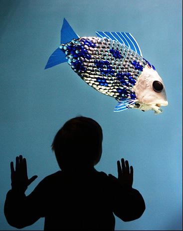 照片于2005年10月7日在伦敦水族馆拍摄,一名儿童正在饶有兴趣地观看一条好似宝石般的机器鱼。不久之后,5条类似的机器鱼将被部署到西班牙海岸,执行搜寻水中污染物的巡逻任务。