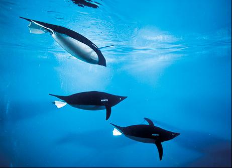图中展示的机器企鹅能够在无需人类帮助下穿越水池,同时还拥有反向游泳能力,这一点与真实的企鹅截然不同。机器企鹅由德国费斯托工程公司设计制造,该公司主要向汽车业销售充气设备。这种仿生机器人在设计上用于测试新技术,费斯托的仿生三角架以及用于在装配线上操纵易碎物体的鱼鳍钳设计灵感都来源于机器企鹅。