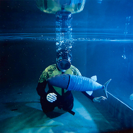 图片展示的是机器金枪鱼“查理”,据信是世界上第一条机器鱼。经过为期3年的研制,这条机器鱼于1994年在美国麻省理工学院上演水下处女秀。“查理”在设计上尽可能多地模拟真实鱼类,它长有40根肋骨、肌腱以及带有椎骨的节状脊椎,同时装有6个发动机,全身零部件数量高达2843个。