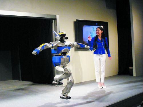 本次展览中还有身高154厘米、体重58公斤的仿人机器人HRP-2。仿人机器人是为人类做各种工作的劳动型机器人的最高形态。HRP-2不仅可以步行,还可以仰卧、苏醒、与人类合力搬运物品、推动重物、穿越障碍、收拾桌椅、跳舞等。