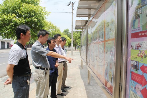 黄陂区科协主席熊克彪(左一)、六指街陈光华主任(左二)正在视察“三万活动”中新建的科普宣传栏。