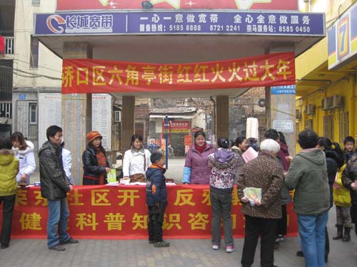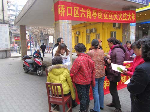 街卫生服务中心的两名医务人员来到现场,免费为辖区居民测量血压,并耐心地向老年居民们讲解了如何安全过冬的知识;六角亭街副主任陈小章与区、街科协工作人员一起为居民送上健康的祝福,并向他们免费赠送《健康每一天》科普书籍;辖区科普志愿者们现场发放了《“家庭拒绝邪教”活动宣讲提纲》,呼吁广大居民“崇尚科学,拒绝邪教”;荣东社区科普站结合创建市级“两型社区”工作,制作了 “两型”知识宣传展板现场展览;社区青少年们也积极行动,走街串巷发放“清剿火灾隐患”宣传手册及城管革命、文明安全燃放烟花爆竹等宣传资料……