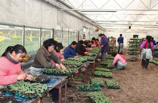 育苗大棚内女工们嫁接西瓜苗的繁忙景象