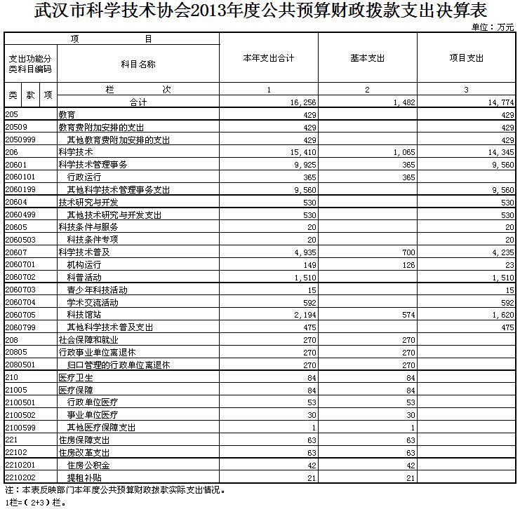 2013年公共预算财政拨款支出年度预算为16,256万元(包括年初部门预算、上级下达的专项转移支付资金及年初结转和结余资金等支出),支出决算为16,256万元,完成年度预算的100%。其中:基本支出 1,482万元,主要是财政补助的行政事业单位机构运行日常公用支出、在职及离退休人员工资福利、医疗保障及住房公积金支出。项目支出14,774万元,主要用于:科普活动支出1510万元,主要成效是:履行湖北(武汉)院士活动中心职责,积协助市委市政府召开“武汉2049远景发展战略规划院士专家咨询座谈会”、完成 “新型城镇化模式下城市发展与运行的建模与优化决策”项目调研、《中国智能城市建设与推进战略研究》咨询项目学术报告及第四次工作组会议;做好院士慰问、来汉院士联络接待等服务工作;院士专家工作站建设全面推进,成立市农科院、武桥重工、天种畜牧等5家院士工作站,提升了企业自主创新和科技成果转化能力;实施科普助推专项行动计划,评出科普助推幸福社区项目22项,科普助推都市农业项目47项。积极组织申报中国科协、省科协科普项目,获中国科协支持项目8个、省科协支持项目15个;实施全民素质纲要行动计划,落实省科学素质办与市政府签订的共建协议,并与各区签订共建协议;全国首届城镇社区科普工作会议在汉召开,中国科协领导对我市社区科普工作给予了充分的肯定;成功举办了2013年武汉市“全国科普日”活动,开展群众性科普日活动500多场次,参与公众超110万人次,市科协、武昌区科协荣获中国科协2013年“全国科普日”优秀组织奖;建立院士专家进校园活动共建机制,开展院士专家进校园活动68场次,受益公众达6万人次;编纂完成《2013年武汉市清洁生产白皮书》,开展清洁生产审核培训班、武汉企业科技创新论坛颁奖、技术创新报告会、创新方法师资培训班等活动;武汉科技咨询服务中心全年组织完成各类“四技”合同295项、科技事务司法鉴定项目14件,法医鉴定项目900余件;武汉科技报社出版发行《武汉科技报》与《少年科普周刊》双刊,各编印50期,期发行量逾5万份;8月创刊的《人•生活月刊》已出版5期; “”政务微博于6月1日正式在新浪网上线运行。青少年活动支出15万元。主要成效是联合有关单位组织实施了第28届全国青少年科技创新大赛——武汉选拔赛、市青少年航海模型竞赛、第29届楚才杯作文竞赛等青少年科技竞赛和科普活动,楚才杯科幻类优秀作品荣获2013年省优秀科普作品奖。学术交流活动支出592万元,主要成效是:国家级科技思想库建设有效推进,形成了10篇高质量的课题研究报告和14篇决策咨询建议、开展科技工作者建议征集评选活动,形成21篇建议、开展科协工作理论研究,形成了17篇优秀调研报告、以《院士专家建议》及《科技工作者建议》形式向中国科协、湖北省科协、武汉市领导报送决策咨询成果,9篇建议获唐良智市长等市领导的重要批示与肯定、在2013年度国家级科技思想库建设试点工作考核中,获得全国第五名、副省级城市第一名;学会能力显著提升,充分发挥科技社团在推动全社会创新活动中的作用,组织实施2013年学会能力提升专项,评选出华中科技大学科协、武汉农学会等11个优秀科技社团,提升了科技社团服务创新能力;学术交流广泛深入,联合中国工程院医药卫生学部、中国医疗保健国际交流促进会主办“医学科学前沿暨妇儿健康发展促进高峰论坛”、 联合国家自然科学基金委、华中科技大学共同主办“亚洲-欧洲增强聚合物材料加工与性质学术研讨会”等高水平学术活动品牌;联合有关部门邀请日本学者松本聪、中国工程院院士曲久辉等专家来汉作关于水生态环境治理的专题报告;组织市属学会成功举办了2013湖北武汉智能电子产业高峰论坛、新型城镇化与系统工程研讨会等有较强影响力的学术交流活动,全年共组织开展学术交流活动400余场次,参加活动的科技工作者3万余人次,促进了学科的繁荣发展和科技与经济的紧密结合;深化对外民间科技交流与合作,受市政府委托,组织有关单位赴德国参加第二届“中德智能化城市建设研讨会”,学习借鉴国际智能化城市建设的先进经验。市科协与台湾财团法人海洋发展教育基金会签订了交流合作协议,与台中科技馆等科技场馆进行了广泛的科技交流,开启了汉台科技场馆合作发展、科普人才交流培养的新篇章;第八届武汉市青少年科普国际夏令营赴瑞士、法国等欧洲国家开展交流学习活动,激发了我市广大青少年对科学探究的热情;实施第四届武汉市优秀科技工作者、第三届武汉市自然科学优秀学术论文政府奖评选活动。科技馆支出11959万元,主要成效是:推进武汉科技馆江滩馆建设项目。租赁合同签订,支付腾退资金。现场施工有序推进,江滩馆大楼土建工程基本完成;推进新馆内同建设,完成设计方案并完成部分内容的指标工作;武汉科技馆老馆展区全年共接待观众30.2万人次;举办“海洋家园”等主题临展,累计接待观众7万余人次;举办各类科普报告会各类11场次;举办各类夏(冬)令营16期、“小小科学家”等培训8期;组织大篷车——流动科技馆到社区、广场、乡村巡展,全年开展宣传活动52次,其中进学校24所、广场9个、社区19个,参与观众5万人次。其他科学技术普及支出698万元,主要成效是:企业科技服务行动深入开展,企业科协积极开展“讲、比”活动,完