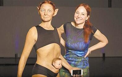 于是罗伯茨以自己身体为基础制作了一个模型。这个模型虽然看起来仍然像人类,但某些器官又类似动物,比如向外张开的猫科动物耳朵、有袋类动物的育儿袋,以及类似章鱼的超大眼球。