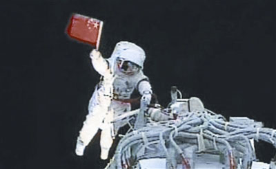 日前,执行神舟七号载人航天飞行出舱活动任务的航天员翟志刚在舱外挥动中国国旗。北京时间9月27日17时,航天员翟志刚在完成一系列空间科学实验,并按预定方案进行太空行走后,安全返回神舟七号轨道舱。这标志着我国航天员首次空间出舱活动取得成功。