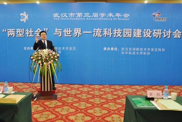 武汉市第三届学术年会第八分会场“两型社会与世界一流科技园区建设研讨会”于11月21日下午在武汉东湖新技术开发区会议中心举行。来自市直有关部门、东湖新技术开发区、部分企业、有关大专院校、市科协系统等200多人参加了报告会。会议由东湖新技术开发区管委会科协主席俞毓林主持,华中科技大学副校长邵新宇致贺词,市政府副秘书长唐惠虎讲话。