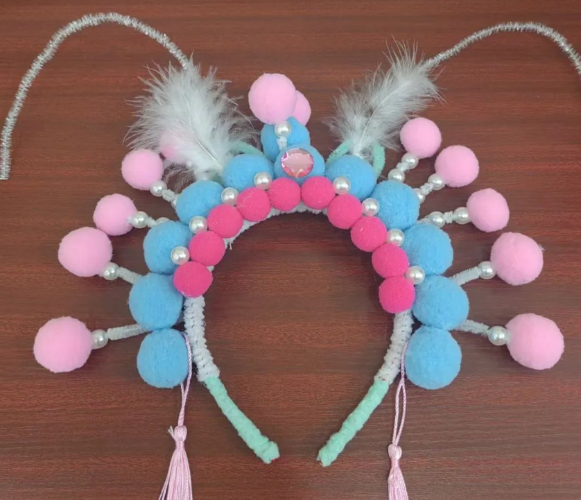 经过几个小时的努力,一个个精美的京剧头饰呈现眼前。这些头饰色彩斑斓、工艺精湛,仿佛带着大家穿越时空,回到了京剧盛行的年代。小组成员们纷纷展示着自己完成的头饰,模仿京剧演员的姿态,摆起了造型,现场气氛达到了高潮。