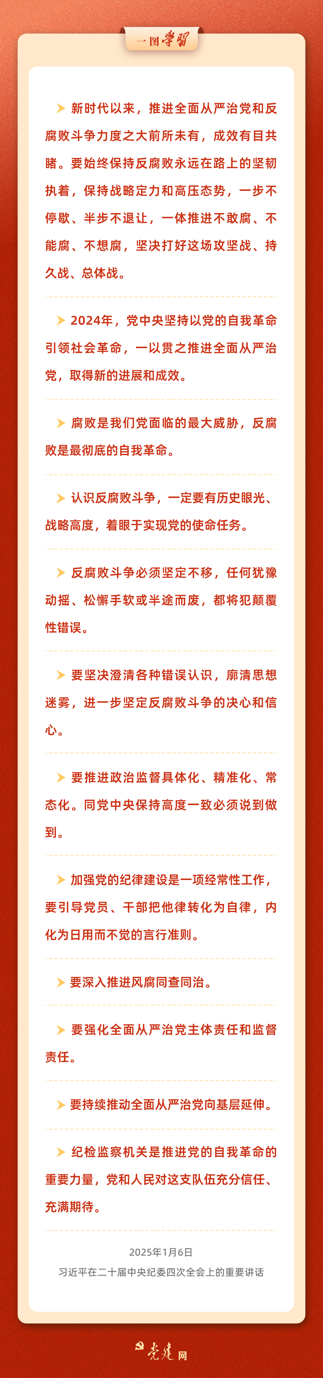 1月6日,习近平总书记在二十届中央纪委四次全会上发表重要讲话,强调坚持用改革精神和严的标准管党治党,坚决打赢反腐败斗争攻坚战持久战总体战。总书记的重要讲话高瞻远瞩、思想深邃、直面问题、振聋发聩,为深入推进全面从严治党和反腐败斗争提供了重要遵循。以下是习近平总书记在二十届中央纪委四次全会上的重要讲话要点梳理,供您学习。