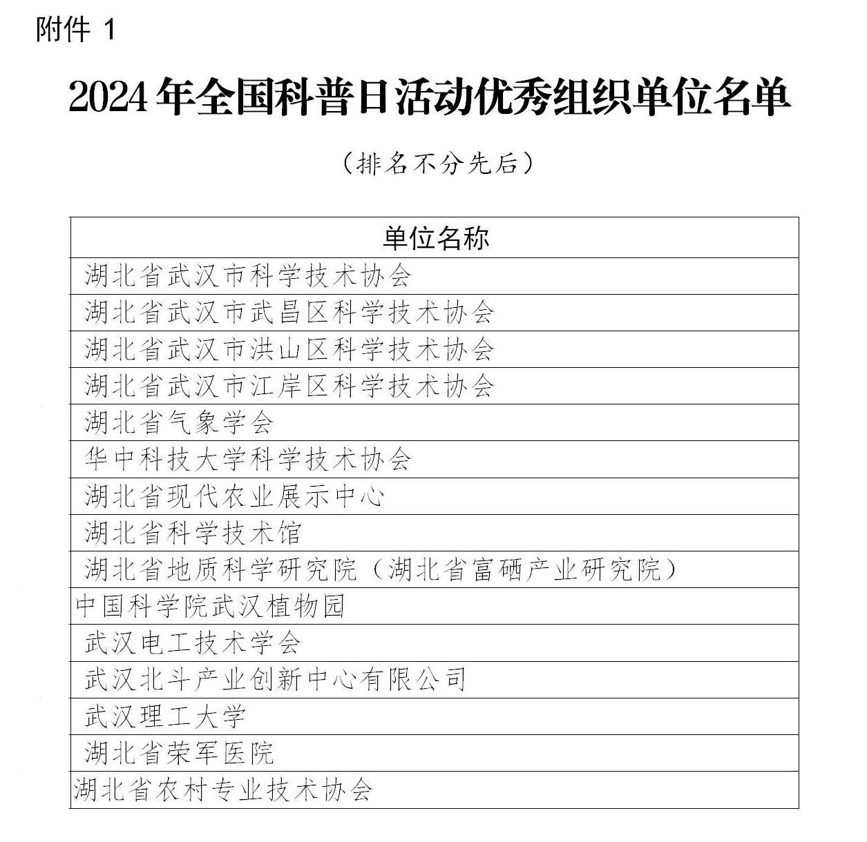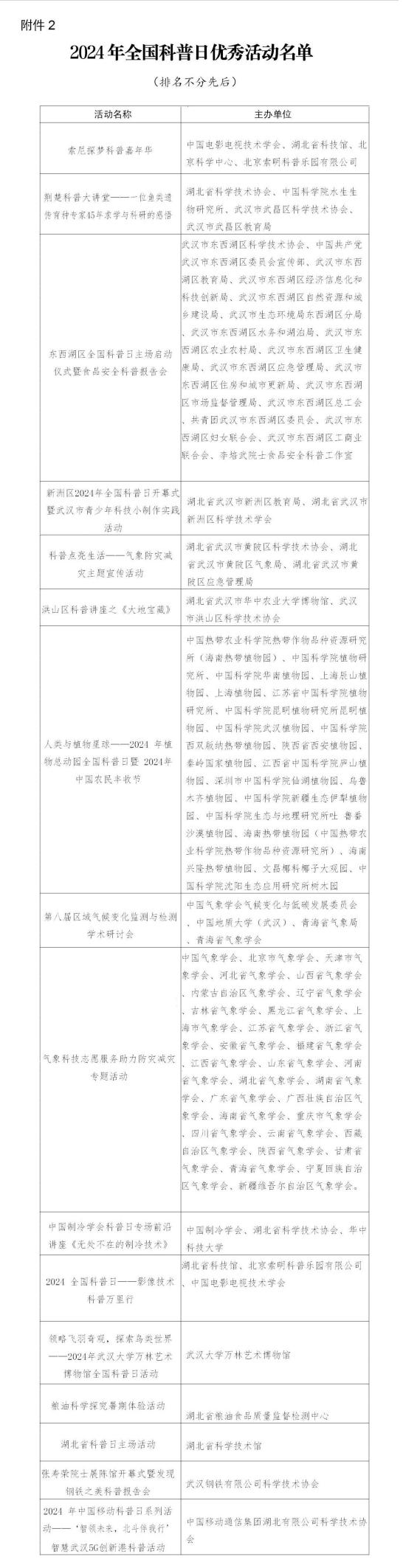日前,中国科协网站发布《中国科协办公厅关于对2024年全国科普日有关组织单位和活动予以表扬的通知》,记者梳理发现,武汉市在本次评选活动中,有等15家单位被评为2024年全国科普日活动优秀组织单位,东西湖区全国科普日主场启动仪式暨食品安全科普报告会等16个活动被评为2024年全国科普日优秀活动。(详见后文图表)