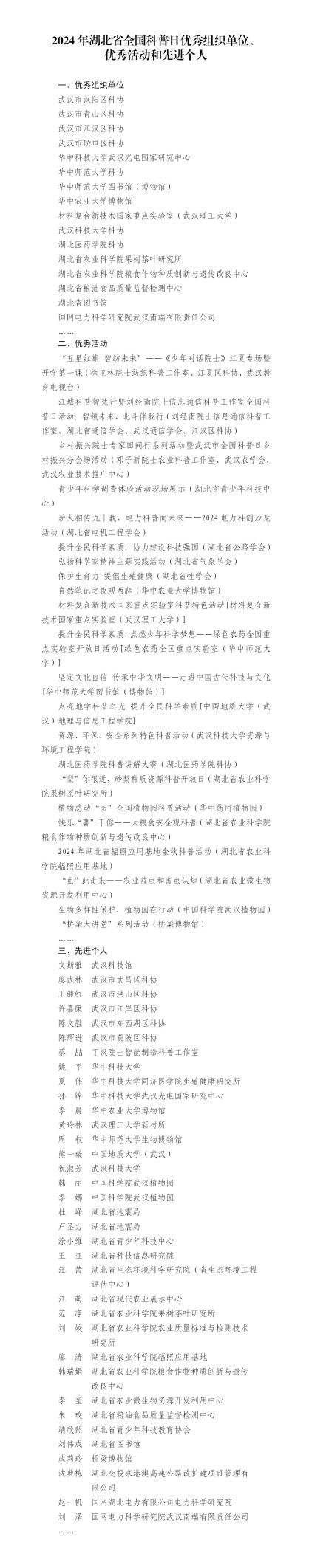与此同时,湖北省科协官网也发布了《省科协关于表扬2024年湖北省全国科普日优秀组织单位、优秀活动和先进个人的通知》,武汉市同样凭借着丰富多样的科普工作在该评选中斩获好成绩。其中,武汉市汉阳区科协、武汉市青山区科协、武汉市江汉区科协、武汉市硚口区科协等16家单位获评2024年湖北省全国科普日优秀组织单位;“五星红旗 智纺未来”——《少年对话院士》江夏专场暨开学第一课等22场活动获评2024年湖北省全国科普日优秀活动;武汉科技馆文斯雅等35位在汉科普工作者获评2024年湖北省全国科普日先进个人。(详见后文图表)