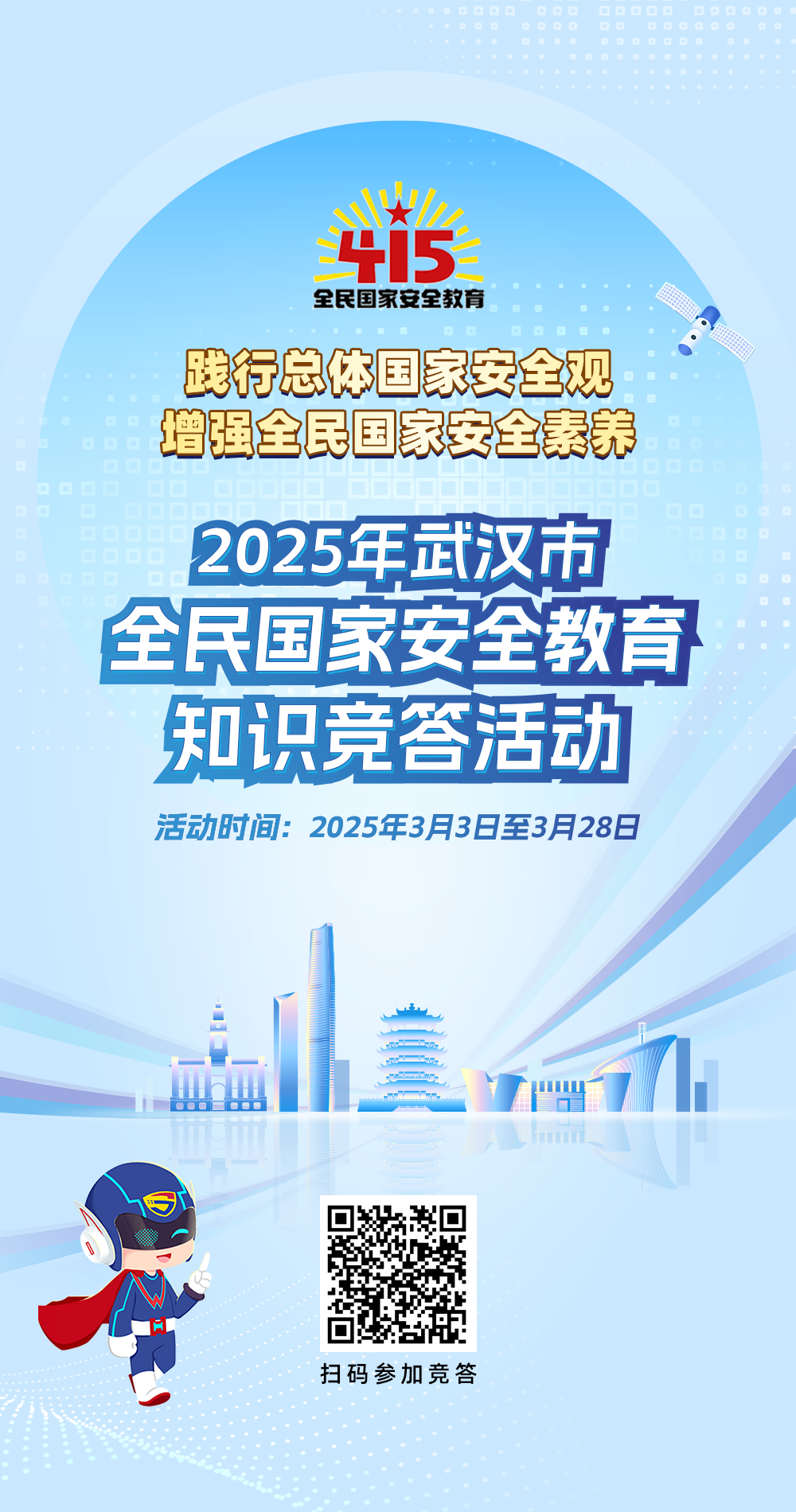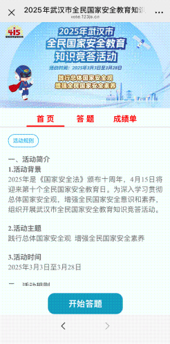 2025年是《中华人民共和国国家安全法》颁布十周年,4月15日将迎来第十个全民国家安全教育日。为深入学习贯彻总体国家安全观,增强全民国家安全意识和素养,2025年武汉市全民国家安全教育知识竞答活动将于3月3日上午10点正式拉开帷幕。