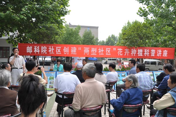 武汉植物园植物专家王畅为40多名居民讲授了家庭花卉养护知识。社区居民与武汉植物园专家现场互动,交流花卉养护经验,专家解答相关知识,对居民花卉进行点评。武汉植物园向居民群众免费赠送孔雀草、海棠、科普小册子,同邮科院社区居民共建“生态植物园基地”10㎡,栽培太空植物。武汉科普大篷车也开进了社区,展示声、光、电演示仪器,宣传了预防甲型H1N1病毒知识,吸引了众多的社区居民和小朋友。