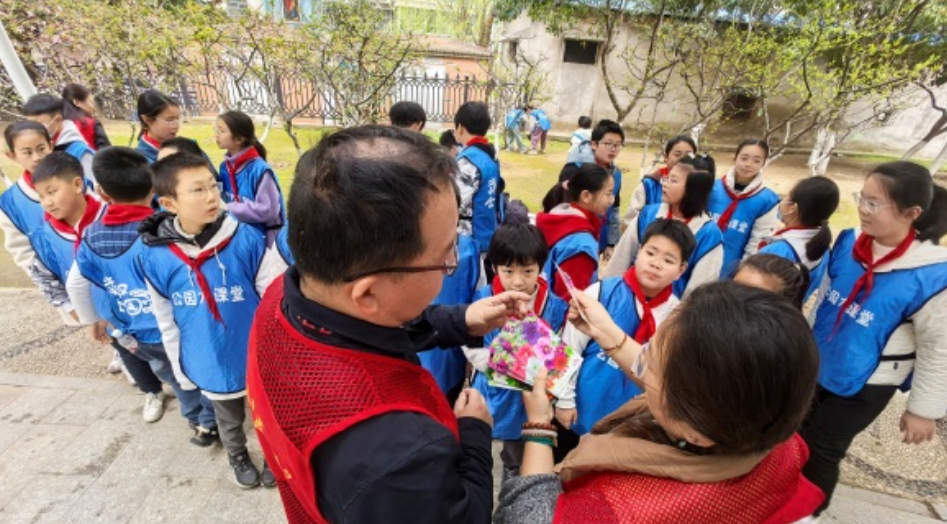 活动当日,孩子们在公园工作人员和社区志愿者的带领下有序进入海棠林。公园的园艺师廖铁虎化身为“植物老师”,通过生动有趣的讲解,带领孩子们认识垂丝海棠与贴梗海棠的形态差异。孩子们好奇地观察着海棠的花朵、枝叶,踊跃提问,现场气氛热烈。随后廖老师为孩子们详细讲解了海棠树的养护知识,包括松土、剪枝、浇水和施肥的技巧与要点。孩子们听得津津有味,对即将开始的实践充满期待。