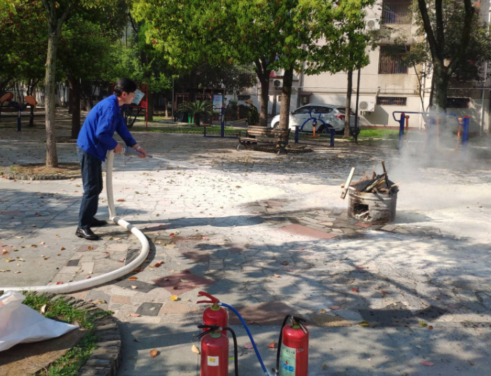 在灭火器和消防水带演练区域,警务室民警与物业工作人员现场演示灭火器“一提、二拔、三握、四压”的使用步骤,以及消防水带的展开、连接与喷水操作。居民们踊跃参与,亲身体验灭火过程,在实践中掌握消防技能。