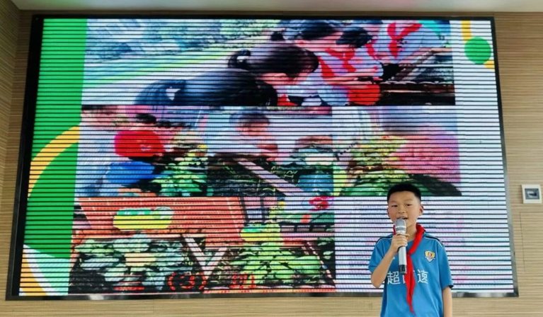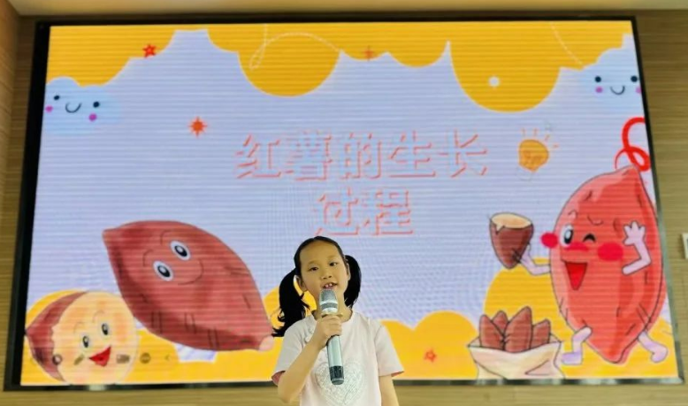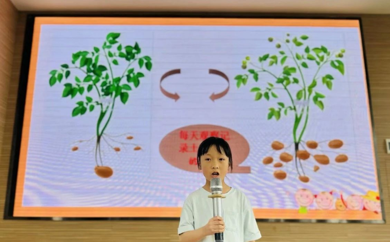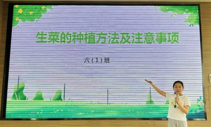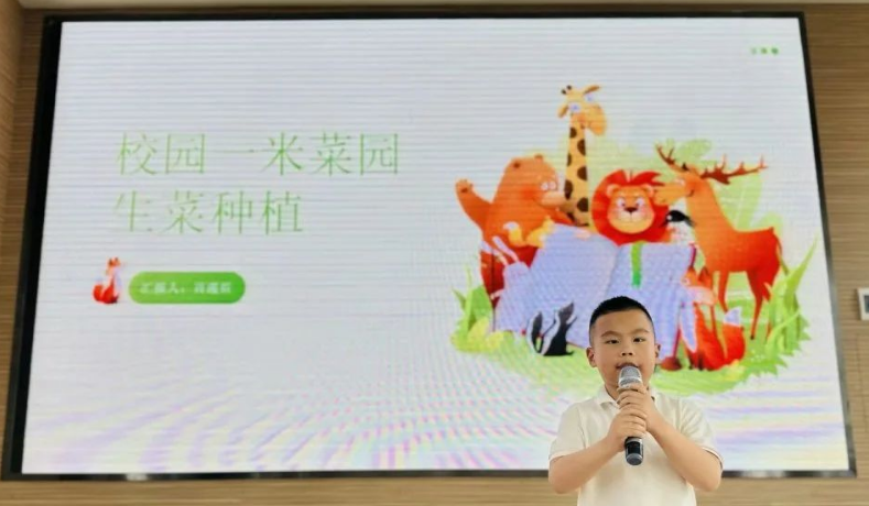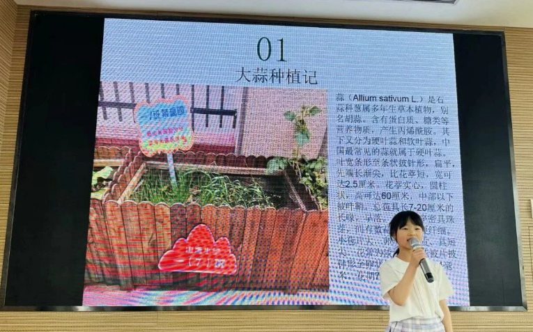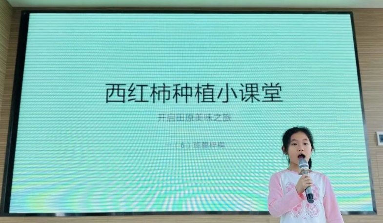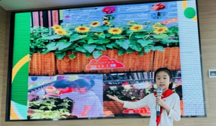 ⼀到六年级的讲解员依次登台,⽤稚嫩的声⾳讲述劳动的喜悦,分享他们的“种植故事”—从嫩芽初绽到硕果累累,每⼀株植物都记录着同学们的汗⽔与智慧。