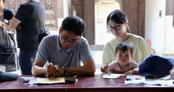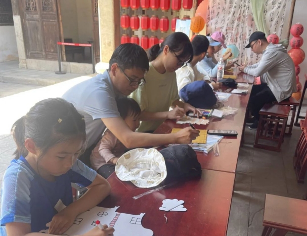 早晨宁静时分,在庞氏老屋内,游客们全神贯注地投入创作。孩童们拓印飞檐的灵动,少年们勾勒斗拱的精巧,大人们晕染砖墙的质朴。一幅幅精美的古建版画跃然纸上,匠心之美于此绽放。纸上的古建与眼前的实景相映成趣。大家纷纷拍照留念,将自己独特的作品和难忘的旅程永久定格。