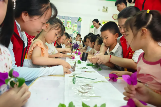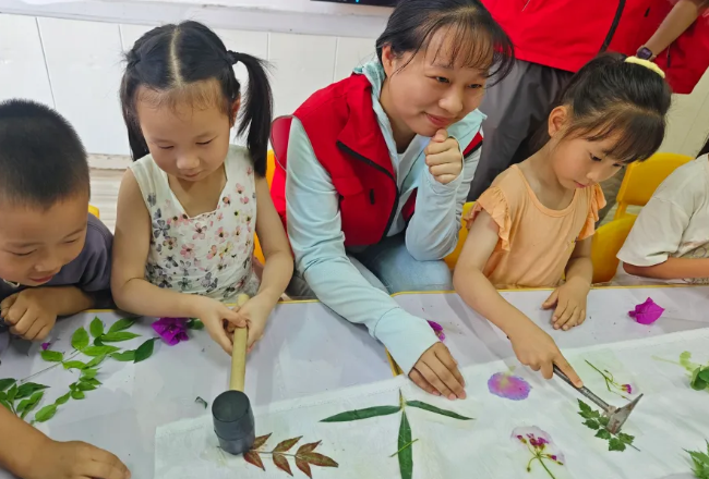 为丰富辖区儿童的校园生活,让孩子们更近距离接触大自然,锻炼动手能力,提升科普知识,增进对植物世界的认识与了解,6月5日下午,将军路街姑李路社区绿色驿站走进华星晨龙城幼儿园,开展“植物拓印进校园 让自然与童趣‘撞个满怀’”活动,带着孩子们在树叶与花瓣的纹理里,解锁自然科普的趣味密码。