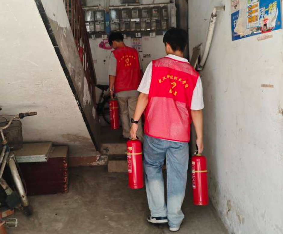 讲堂结束后,志愿者还积极投入到社区志愿服务中。他们深入欧景苑毗邻区新湘村,协助社区工作人员完成两栋十个单元过期灭火器的更换。