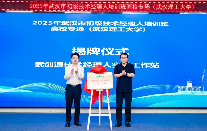 开班仪式上,武汉武创通科技服务有限公司董事长盛毅与武汉理工大学科技合作与成果转化中心主任孙华君共同为“武创通技术经理人实践工作站”揭牌,武创通首个技术经理人实践工作站(以下简称“实践工作站”)正式揭牌落地。