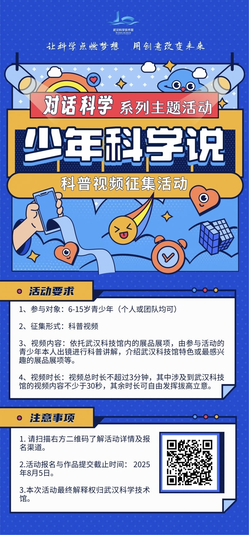 为充分激发青少年对科学的兴趣与热爱,发挥青少年科学创意,武汉科技馆在暑期推出“对话科学”系列科普主题活动,面向全社会6-15岁青少年公开征集科普视频和科幻绘画作品。无论你是热爱讲解的“科学小达人”,还是充满幻想的“未来艺术家”,这里都为你提供展示才华的舞台!