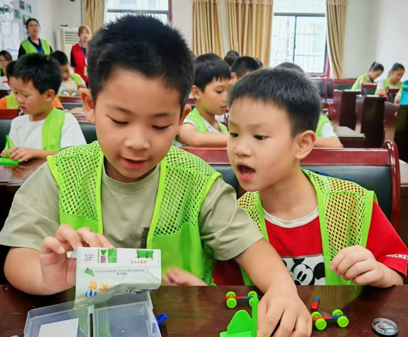 最让人期待的,是从磁悬浮列车延伸出的动手环节。孩子们两两一组,迫不及待地开始组装简易的磁力小车,探索磁力的奥秘。虽然这些简易装置无法实现真正的悬浮,但当孩子们轻轻推动小车,看着它在磁力的作用下平稳滑行时,那种成就感和喜悦溢于言表。