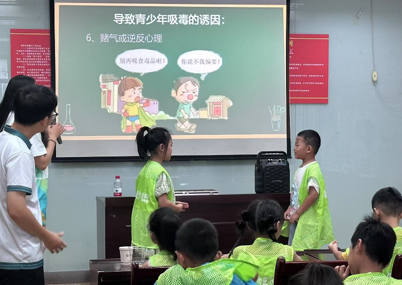 随着社会的快速发展,毒品问题日益成为影响青少年健康成长的隐形杀手。青少年正处于身心发展的关键时期,好奇心强、辨别能力弱,极易受到不良诱惑的侵害。因此,7月22日,望丰社区携手吴家山街社区戒毒康复中心及武汉科技大学生命科学与健康学院的志愿者们为暑期托管班的孩子们带来了一场意义深远的禁毒知识讲座。