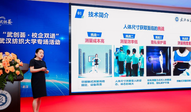 在项目路演环节,来自武汉纺织大学计算机与人工智能学院、材料学院、纺织学院、结构功能一体化复合材料团队的代表展示了“3D智能人体测量系统”“抽丝剥茧——纳米纤维的分离技术研究及产业化应用”等五个路演项目。这些项目在核心技术、应用场景等方面展现出创新性,为科技创新与产业创新融合发展激活动能。