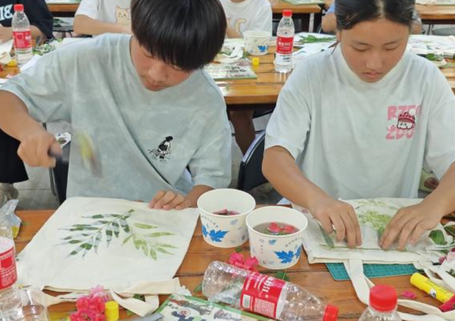压轴的拓印DIY环节里,孩子们用寻来的叶片创作:固定叶片、轻敲拓印,脉络纹路渐次显现在帆布包上。在指导下,有人拼贴叶片组合图案,有人搭配色彩点缀,一件件带着自然印记的作品新鲜出炉,成就感溢于言表。