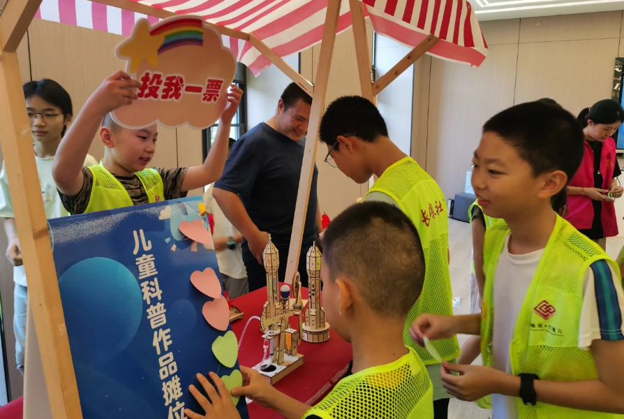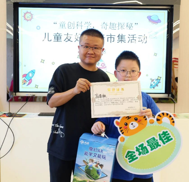 在最受关注的投票环节,30名小评审员手持彩色贴纸,认真贴在心仪作品旁。3名“小小观察员”仔细监督,确保公正。经过紧张计票,3D地球仪、拼装玩具和鲁班锁套装等奖品各归其主。“自己的作品获得一等奖,这是我的高光时刻!”获奖儿童高荣秩兴奋欢呼,脸上洋溢着幸福的笑容。这种成就感,正是科普惠民活动激发青少年科学兴趣、培养创新自信的直接成效。