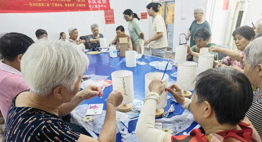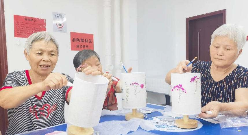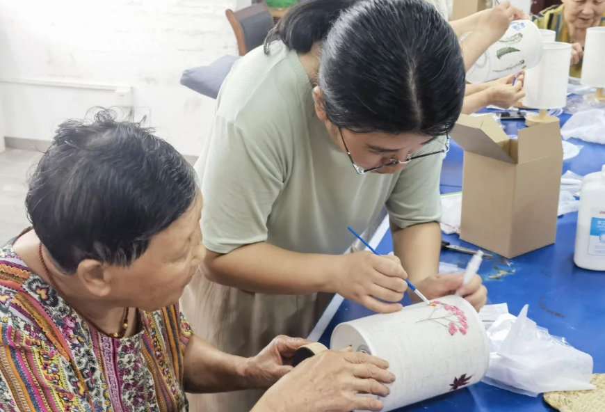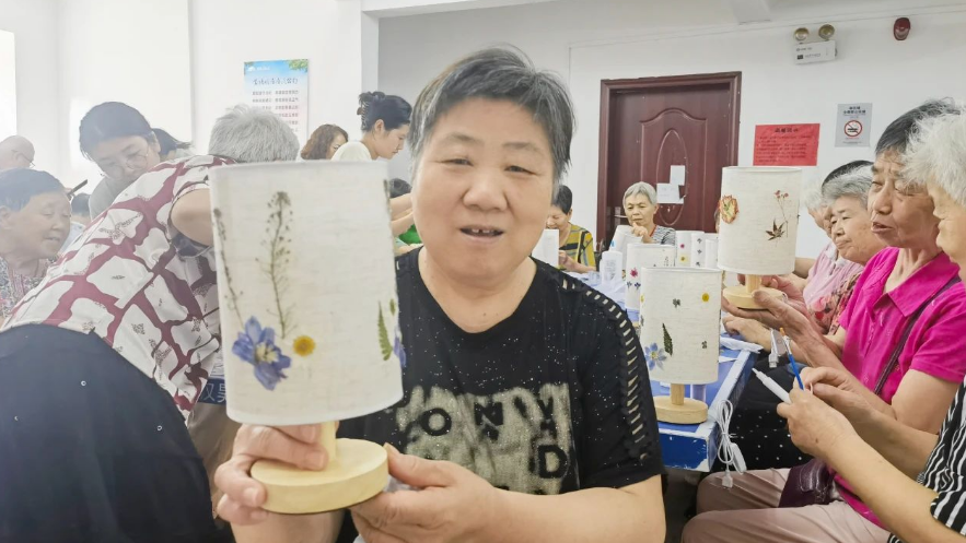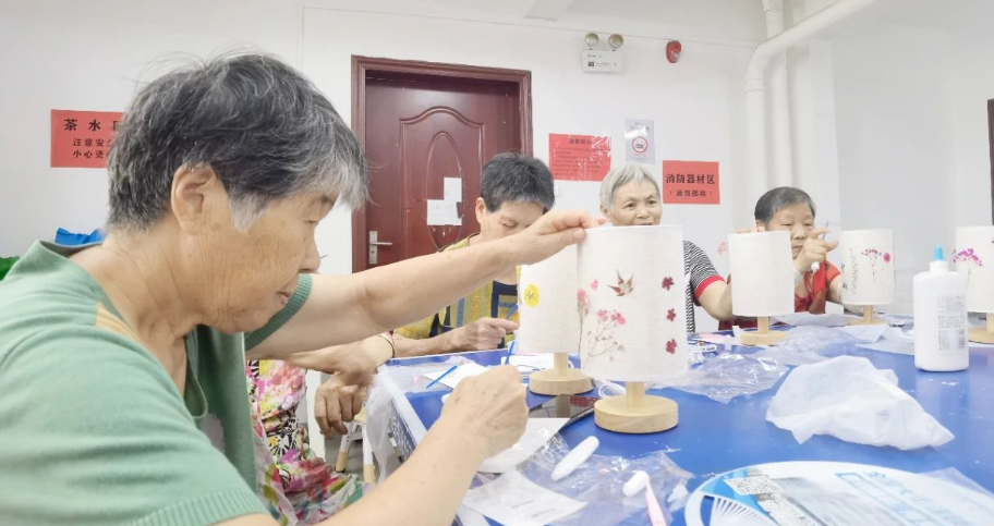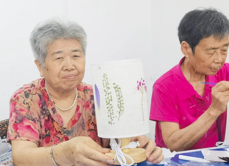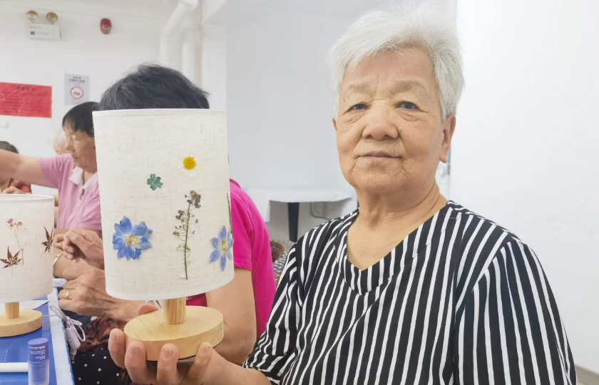 随后,自由创作环节正式开始。居民们根据所学技艺,开始挑选干花、设计造型、粘贴灯罩,整个活动室充满了欢声笑语。社工工作人员巡回指导,耐心解答居民在制作过程中遇到的各种问题,确保每位参与者都能顺利完成作品。一盏盏精美的压花台灯在居民们的巧手下逐渐成形,每一盏都凝聚着他们的智慧和创意。