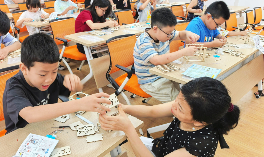 活动伊始,黄佳璐以生活中的物理现象为切入点,用通俗的语言讲解牛顿摆的“动量守恒”原理与风力发电机的“能量转化” 知识,从“为什么牛顿摆能持续摆动”到“风车如何将风能变成动能”,一个个趣味问题瞬间点燃了孩子们的探索热情,现场举手提问的声音此起彼伏。随后,手工制作环节正式开启,孩子们在家长、大学生志愿者及团青小组成员的分组指导下,有条不紊地组装牛顿摆的支架、悬挂钢球,拼接风力发电机的扇叶与底座。过程中,志愿者们耐心示范组装步骤,家长们则陪伴孩子调试零件,遇到“钢球悬挂不平衡”“扇叶转动不顺畅”等问题时,大家共同讨论、反复尝试,亲子间的协作与互助让现场氛围格外温馨。