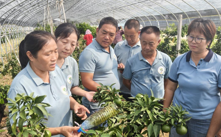 理论学习结束后,全体人员前往刘小丫家庭农场柑橘种植区开展现场指导培训。区科普基地联盟成员单位的技术骨干深入果园一线,结合田间实际情况,与大家分享柑橘病虫害识别、监测与绿色防治技术,手把手演示科学用药、物理防控等实操方法;同时,联盟成员还以科技志愿者身份,主动对接种植户需求,针对果树修剪、水肥管理等生产难题提供个性化指导,现场互动频繁,种植户们认真记录要点、积极提问交流,“田间科普+志愿服务”的模式让技术知识真正落地见效。