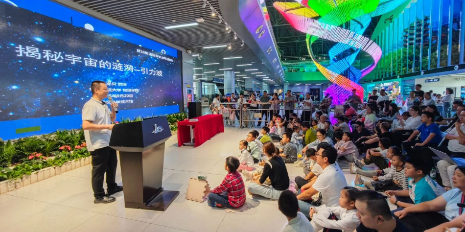 9月20日,武汉科技馆首个全国科普月主题科普活动——“奇妙的科技馆”迎来新一期“遇见•科学大师见面会”。华中科技大学物理学院教授、博士生导师王炎与大家相约科技馆,一起揭秘宇宙的涟漪—引力波。王教授现场播放了模拟引力波独特的啁啾声,认识引力波,从“聆听”它的信号开始。