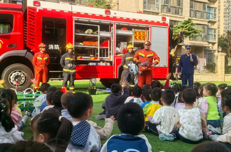 随后,中大班幼儿转移到八角亭参加消防安全知识培训。三店消防救援站的消防员以生动有趣的方式,为孩子们讲解防火常识和自救要点。孩子们围着消防员,眼中充满好奇与敬佩。活动最后,幼儿园还向消防救援站赠送锦旗,红色的缎带在阳光下格外鲜艳。