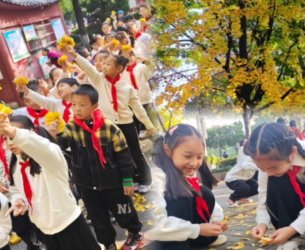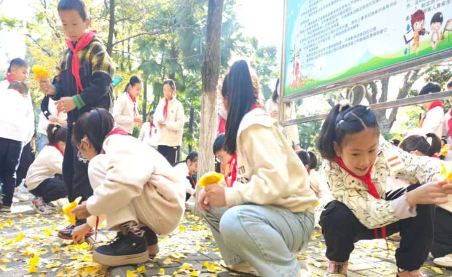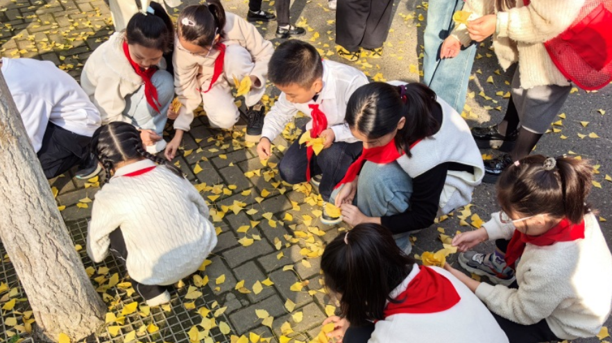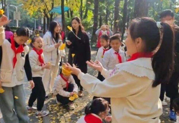 活动当天,学校老师、社区工作人员与志愿者带领同学们来到硚口公园银杏大道。金黄的银杏叶随风摇曳,同学们化身“自然观察员”,近距离欣赏银杏树的挺拔身姿,仔细观察叶片的形态纹理,小心翼翼地捡拾飘落的银杏叶,为后续手工创作收集“天然素材”。