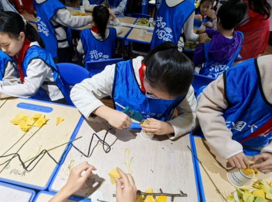 科普环节结束后,手工创作正式开始。在志愿者老师的指导下,同学们将捡拾的银杏叶与纸杯、树枝等材料巧妙结合:以纸杯底部的圆形为基础,将银杏叶层层粘贴,打造出牡丹花瓣的立体层次感;再用纸杯底部做花托,用树枝作花枝,一步步将零散的材料变成一朵朵形态逼真的银杏牡丹。同学们充分发挥想象力,精心摆放、耐心粘贴,现场充满欢声笑语。