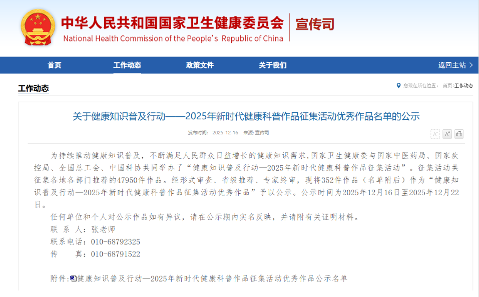 本次科普作品征集活动由国家卫生健康委主导的重大专项行动,同时联合国家中医药局、国家疾控局、全国总工会、中国科协共同举办,其年度科普作品征集评选是全国范围内级别最高、最具权威性的健康科普赛事之一。活动共收到各地各部门推荐的47950件作品,经形式审查、省级推荐、专家终审等多轮筛选,最终352件作品入选优秀名单,华中科技大学大学生快乐科普团队的参赛作品凭借扎实的专业性、通俗的表达力成功跻身其中。