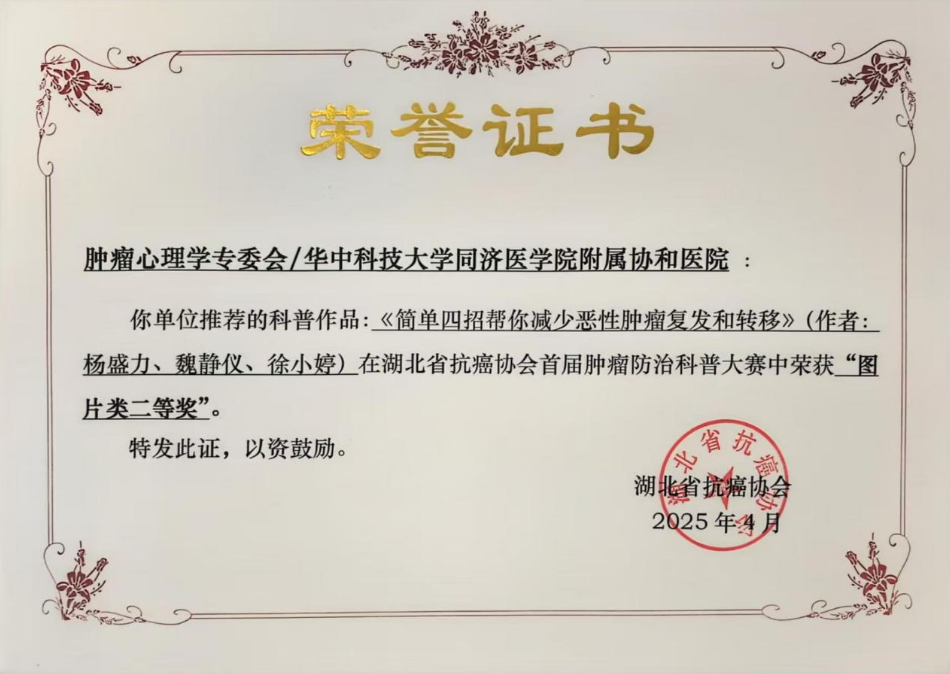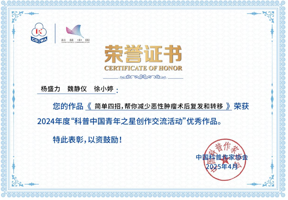 近日,从国家卫生健康委传来喜讯,由江汉区科协指导的华中科技大学大学生快乐科普团队杨盛力、魏静仪、徐小婷联合创作的科普作品《简单四招帮你减少恶性肿瘤复发和转移》,从“健康知识普及行动——2025年新时代健康科普作品征集活动”中脱颖而出,获评国家级优秀作品奖。