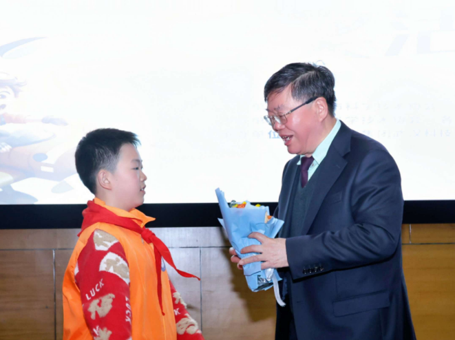 紧随其后的王子月,迈着轻快自信的步伐走上台。这位来自水果湖第一小学五年级的小记者,已是拥有四年资历的“资深记者”,天生大胆的她,面对院士毫无怯意。“桂爷爷的课讲得太精彩了!比课本里的知识更精细、更准确,还特别有意思。”王子月直言,自己一直对生物科学充满好奇,桂院士在宣讲中提到的鱼类遗传多样性等专业知识,让她听得入了迷。尤其是院士分享如何通过科研技术培育优质品种的故事,让她真切感受到“科学改变生活”的力量。“献花是想谢谢桂爷爷,让我看到了科研的魅力,也坚定了我以后多学科学知识的决心。”