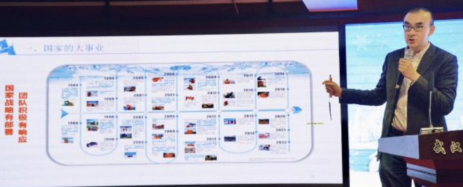 “当会议表决议程时,主席团一敲锤子说:‘请非协商国到会场外喝咖啡’”安家春以1983年中国代表团在南极条约会议上无奈旁听的屈辱往事开篇,瞬间抓住了所有听众的心。他并未过多渲染情绪,而是平静地陈述事实:“只有在南极建立了考察站,才会被认为是协商国。”紧接着,他展示了1984年底591人远征南极、1985年长城站建成、五星红旗首次在南极飘扬的历史画面。“测绘到哪里,祖国权益就延伸到哪里。”这句话通过专家的口说出,不再是口号,而是几代科考队员用青春与汗水验证的誓言。从“无权发言”到“建站有为”,这段艰辛历程,生动诠释了“胸怀祖国、服务人民”的爱国精神与“勇攀高峰、敢为人先”的创新精神是如何在国家的紧迫需求下,化为迎难而上的集体行动。